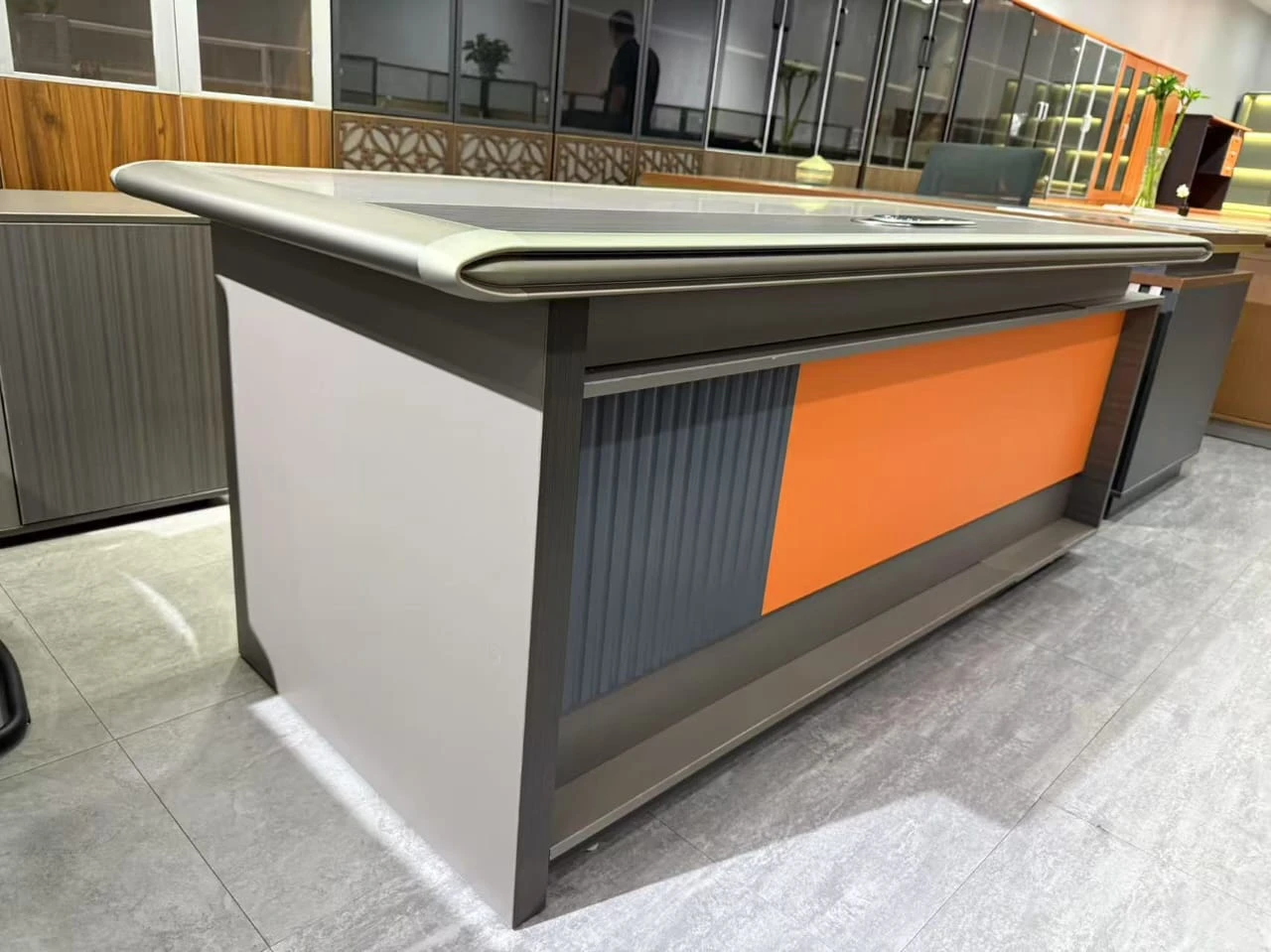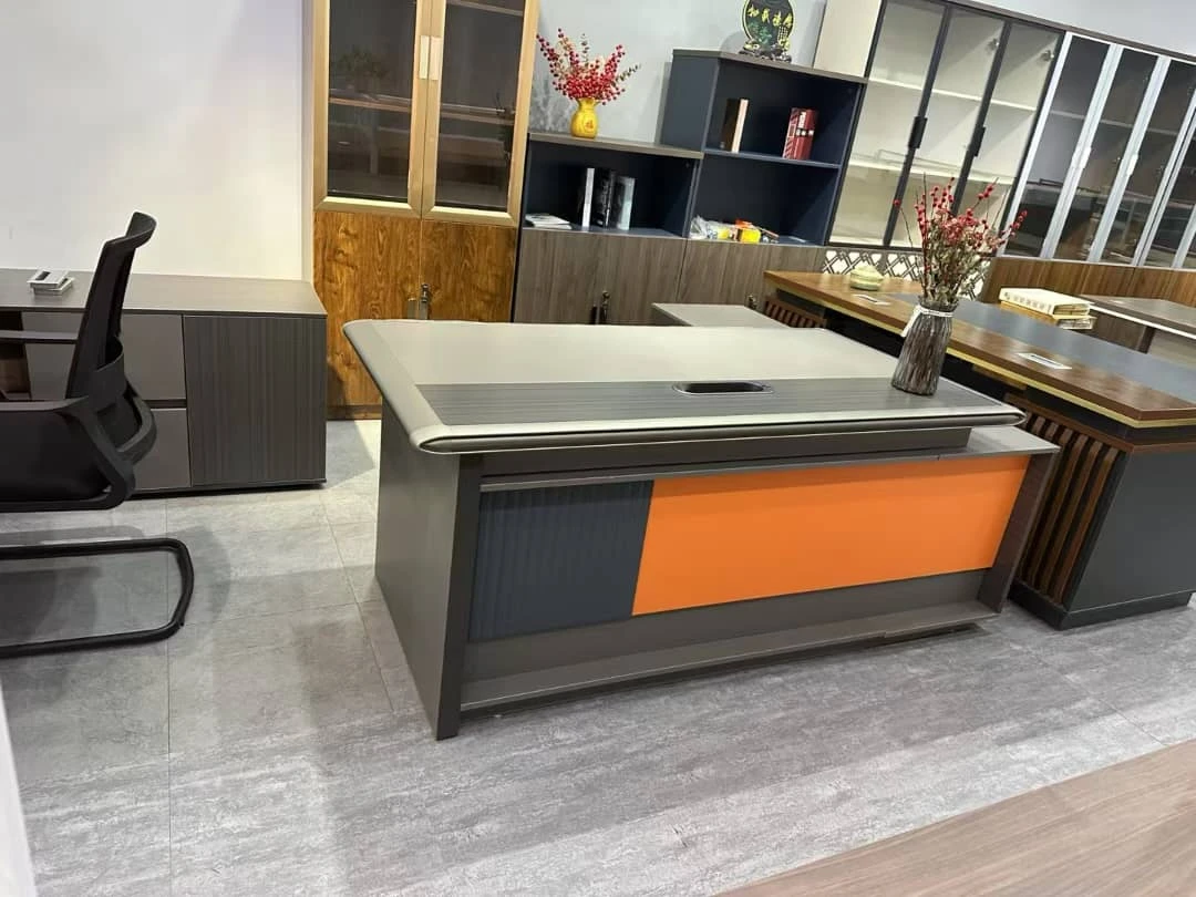 Executive table colour: Gray and Orange L extension: Yes Side drawers: Yes |